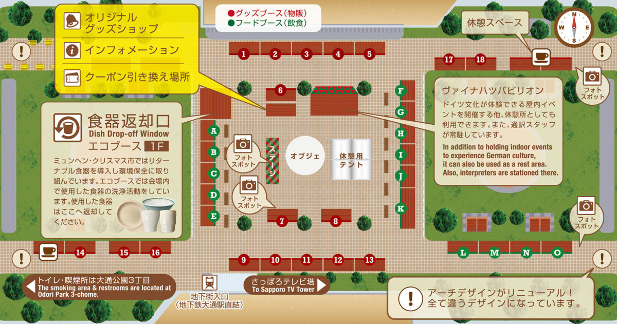 以下では、A~O(フードブース)をアルファベット順、1~18(グッズブース)の番号順にみていきます♪