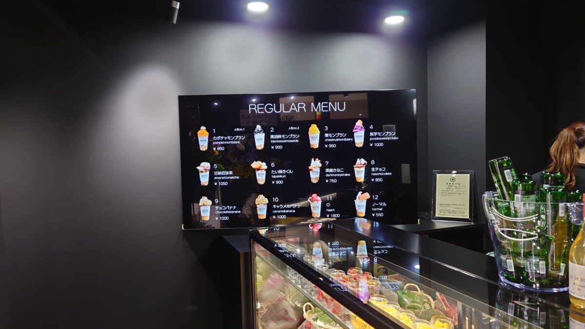 メニューを表示した液晶パネルや、こだわりのフルーツが並べられたショーケースがあります。
